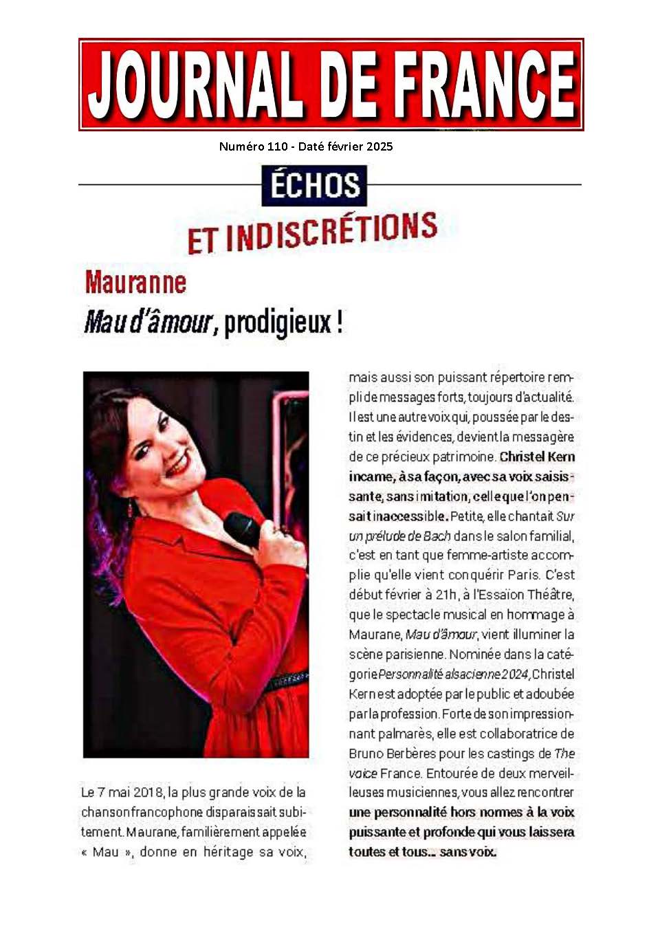 Christel Kern incarne, à sa façon, avec sa voix saisis- sante, sans imitation, celle que l’on pensait inaccessible. Petite, elle chantait Sur un prélude de Bach dans le salon familial, c’est en tant que femme-artiste accomplie qu’elle vient conquérir Paris. C’est début février à 21h, à l’Essaïon Théâtre, que le spectacle musical en hommage à Maurane, Mau d’amour, vient illuminer la scène parisienne.